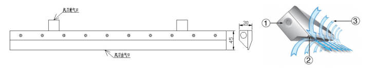 ③而形成一面薄薄的高強度、大氣流的沖擊氣幕,氣幕強非常均勻。氣刀具有噪音低(69db)分貝以下,耗氣量少,表面經過電鍍氧化處理,使用壽命10年以上,用起來節(jié)省90%以上等優(yōu)點。